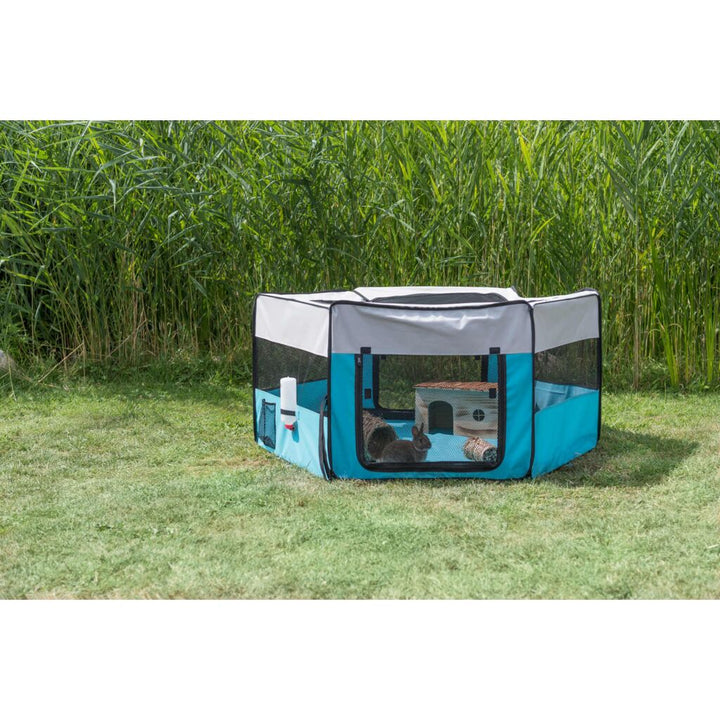 Trixie Freilauf ist Ihre Lösung für Vierbeiner, die gerne in Freiheit spielen! Der strapazierfähige Polyesterstoff und die spezielle Gummierung verhindern Unreinigungen und Bodennässe, während Seitenränder, die abnehmbare Bodeneinlage, die Öffnung für eine Tränke, die zwei Seitentaschen und ein Netz Ihrem Liebling Komfort und Sicherheit bieten. Fixierbar mittels Schlaufen und mit einer Transporttasche zusammenfaltbar und platzsparend zu verstauen – Trauen Sie Ihrem Liebling die Freiheit!