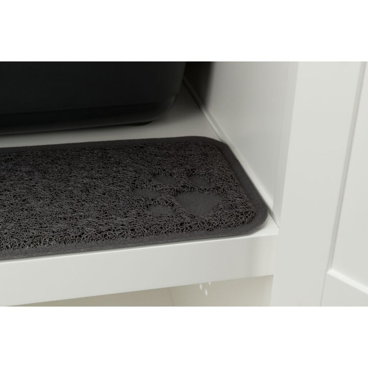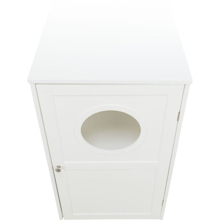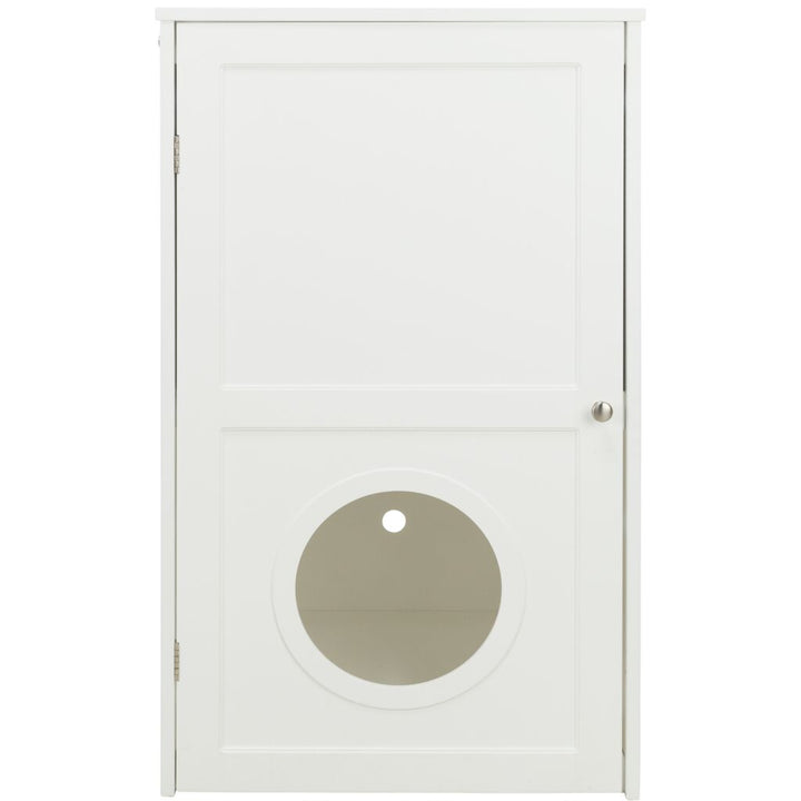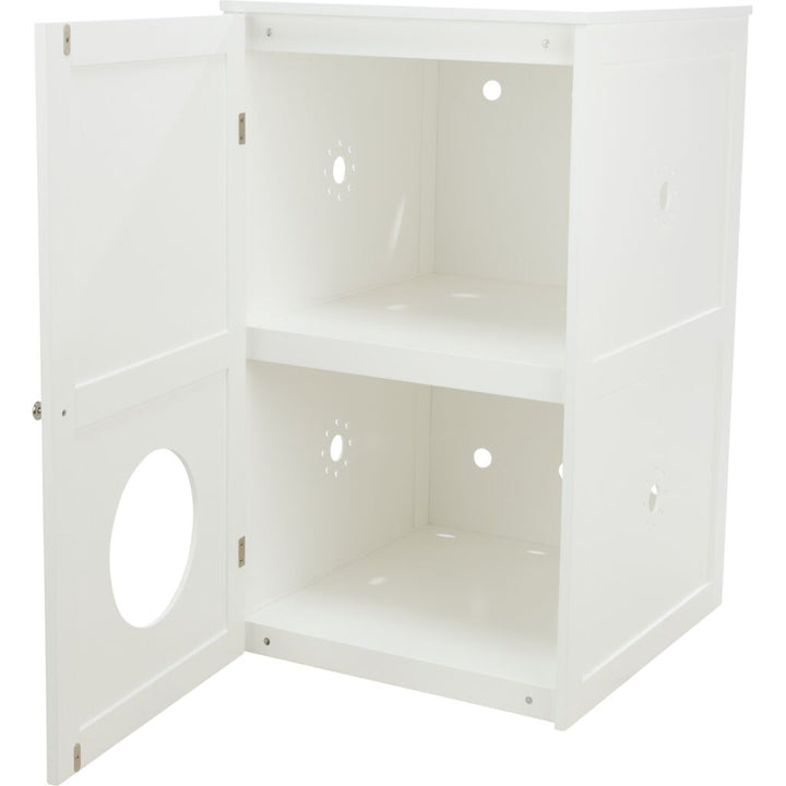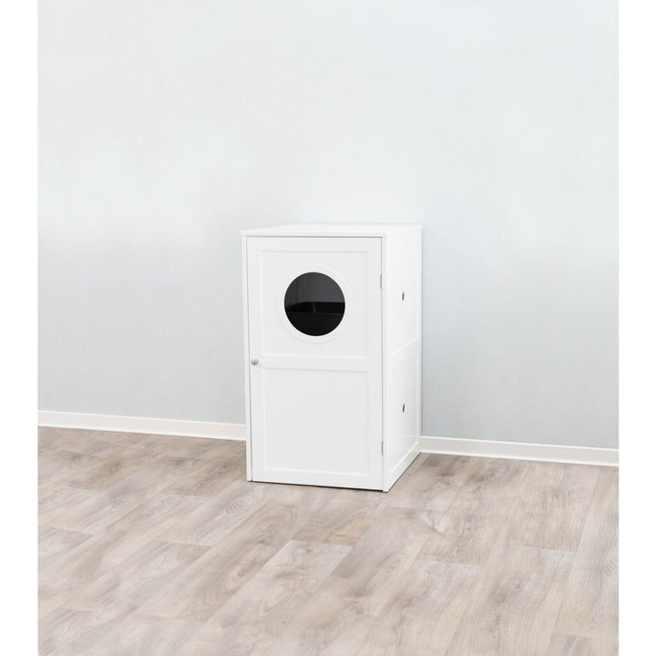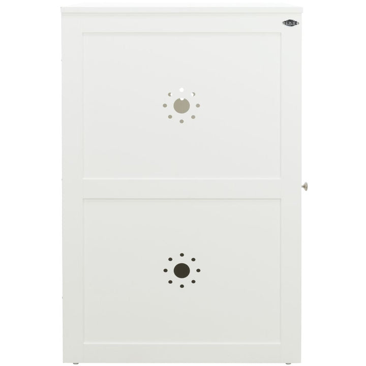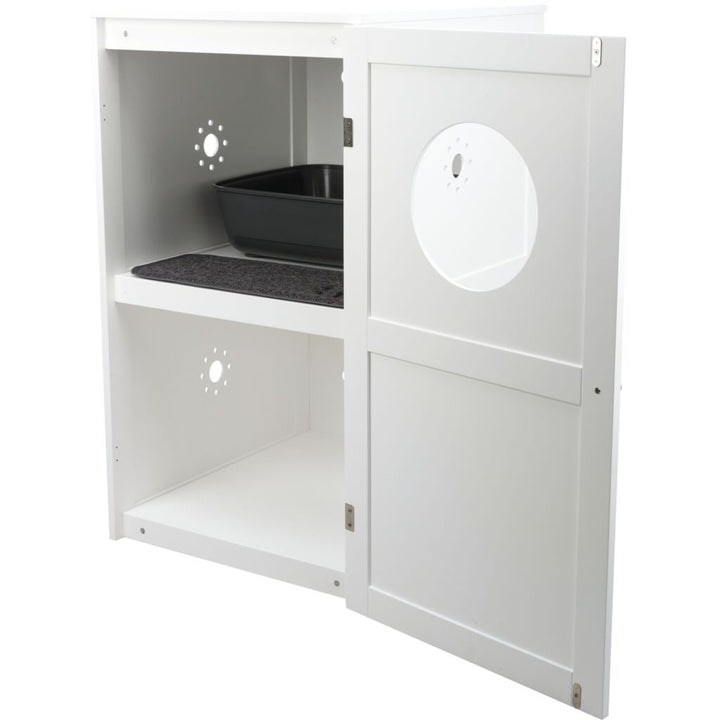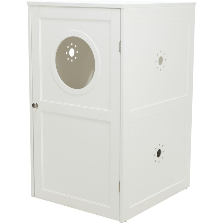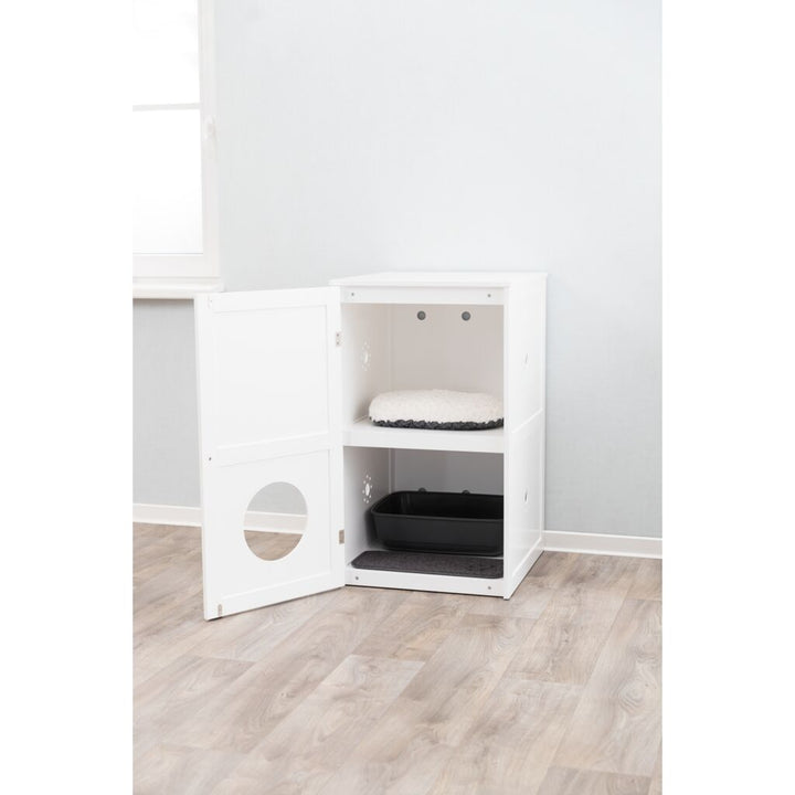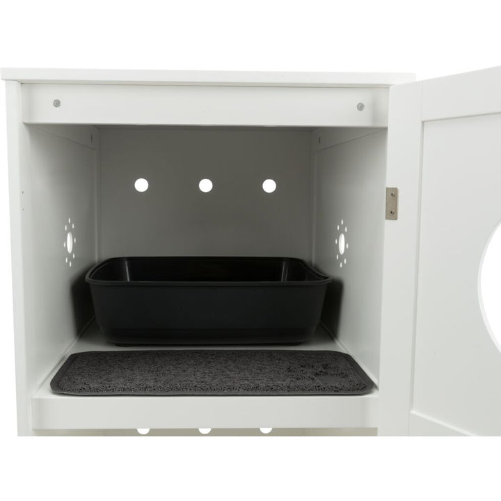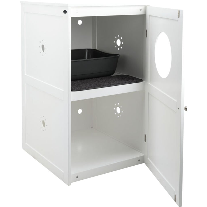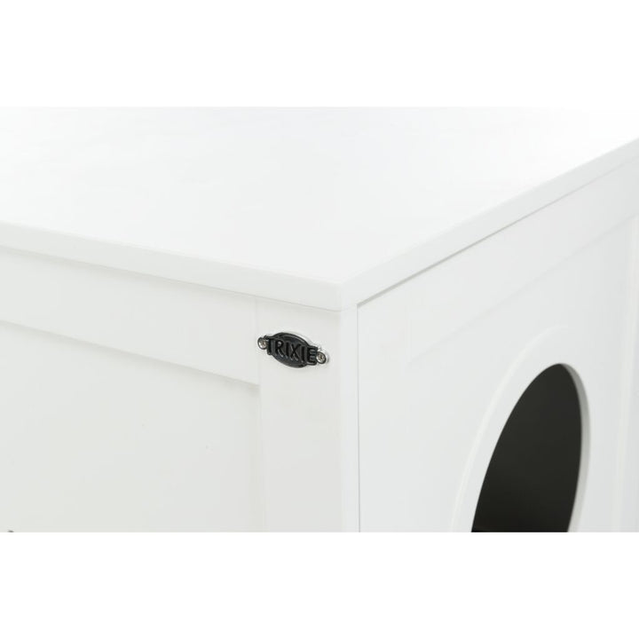 Verstecken Sie die Katzentoilette Ihrer Katzen im Katzenhaus für Katzentoilette XL von Trixie! Es verhindert das Austreten der Streu und bietet Platz für Utensilien, regelmässiges Säubern und eigene Spielereien. Ein Magnetverschluss für die Tür, Einstiegslöcher oben und unten und das Einstellen des Eingangs nach rechts und links sorgen für extra Komfort. Coole Katzensache! 53 × 90 × 58 cm. Weiss.