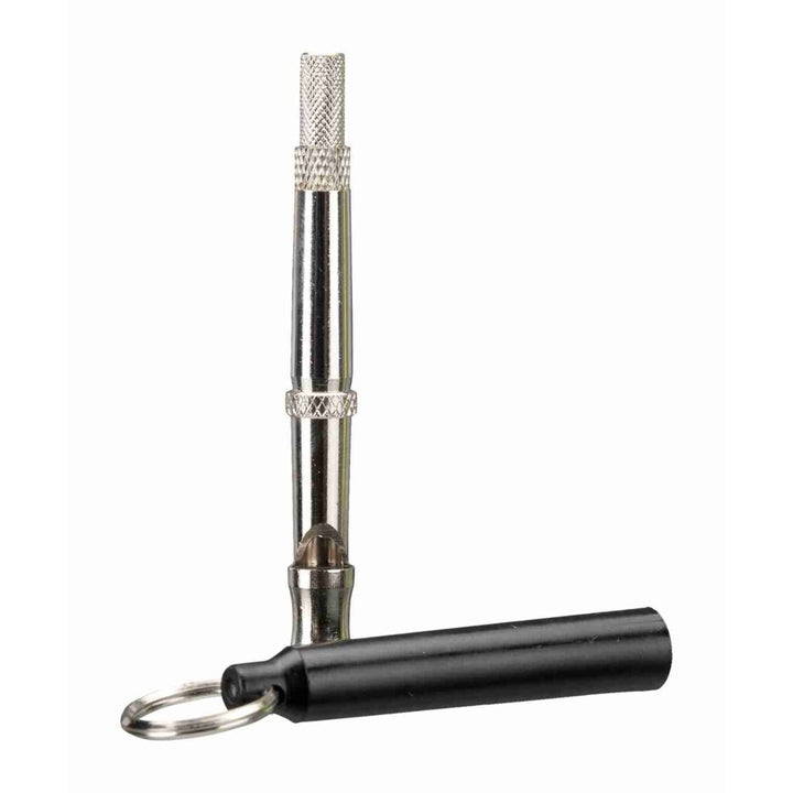 Die Tonhöhe ist bei der Hochfrequenzpfeife individuell einstellbar. Mit Hilfe der Einstellschraube, die sich unter der Kunststoffkappe (Frequenzschutz) befindet, können Sie den für Ihren Hund passenden Ton festlegen. Die höheren Töne sind für den Nahbereich und die tieferen Töne für weitere Entfernungen. Die Tonhöhe lässt sich mit der Mutter unterhalb der Einstellschraube fixieren.