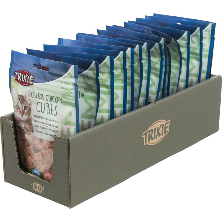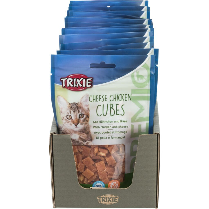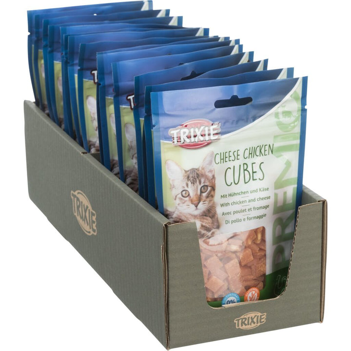 Schnurrt Eure Katze vor Wonne, wenn sie PREMIO Cheese Chicken Cubes zu kosten bekommt! Mit über 81 % Fleischgehalt, verschiedenen Käsesorten und ohne Zuckerzusatz sind diese köstlichen Katzensnacks eine Delikatesse. Der wieder verschliessbare Beutel sichert die frische und als Krönung sind die Cube auch noch glutenfrei - Euer Stubentiger wird miauen vor Freude!
