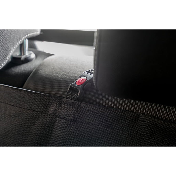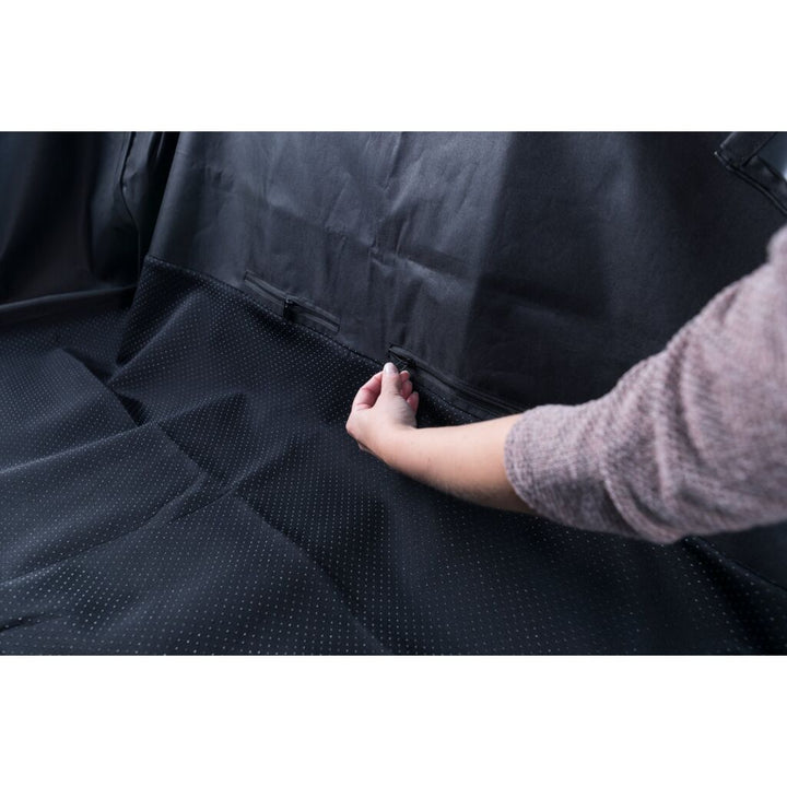 - Seitenteile können zum Ein- und Aussteigen durch zwei Reissverschlüsse heruntergeklappt werden und schützen so Polster und Verkleidungen