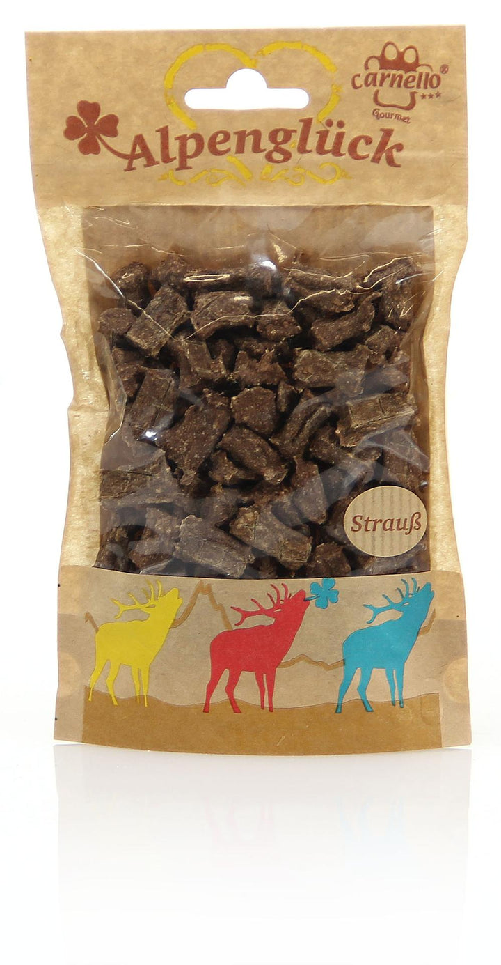 Hypoallergene Häppchen aus feinem Straussenfleisch. Über Buchenholz getrocknet und schön knusprig. Fettarm, für gewichtigere Vierbeiner geeignet. Auch toll für’s Training oder auf Reisen. Mit reinem Gewissen füttern: stammt nicht aus Massentierhaltung.