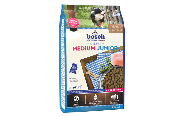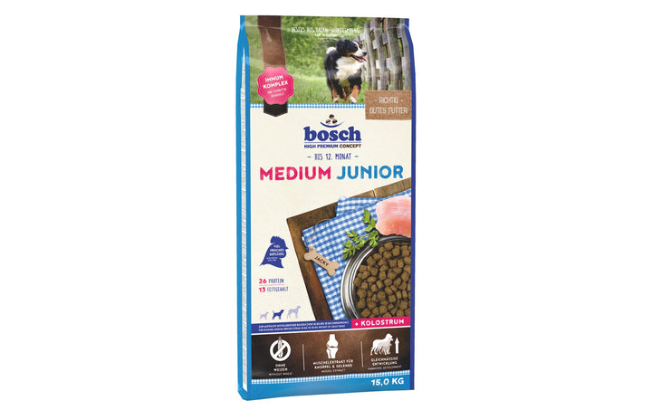 Das Trockenfutter Medium Junior eignet sich besonders für die Aufzucht mittelgrosser Welpen im Gewichtsbereich von 15 bis 25 kg. Es fördert eine gleichmässige, nicht zu schnelle Entwicklung Ihres jungen Hundes. Die Krokettengrösse und -form sind den Erfordernissen mittelgrosser Hunde angepasst. Das Futter wird ohne Weizen aber mit viel frischem Geflügel hergestellt. Durch den Einsatz von Kolostrum wird das Immunsystem ebenso gestärkt wie durch den spezifischen von Tierärzten entwickelten Immun-Komplex aus Mannanen und Glucanen. Die enthaltenen Muschelextrakte unterstützen die Knorpel- und Gelenkentwicklung Ihres Hundes