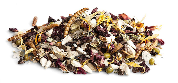Zusammensetzung: Buchweizen, Kardisaat, Reisflocken, Rote Bete, Mungobohnen, Sesam, Mehlwürmer (3%), Mariendistelkraut, Rosenblüten, Hibiskusblüten, Ringelblumenblüten