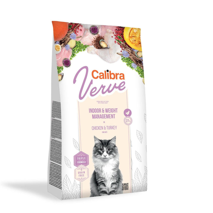 Calibra Cat Verve Indoor + Weight Management Chicken & Turkey ist eine getreidefreie Vollnahrung mit einem hohen Anteil an Frischfleisch aus Huhn und Pute. Die Rezeptur ist sowohl für Hauskatzen als auch für solche, deren Körpergewicht kontrolliert werden muss, geeignet. Frisches Hühnerfleisch macht 27 % des gesamten Inhalts aus. 80,8 % des Gesamtproteingehalts der Rezeptur sind tierischen Ursprungs. Dieses Futter ist nicht nur sehr nahrhaft und natürlich ausgewogen, sondern auch leicht verdaulich für Fleischfresser wie Katzen. Die knusprigen Happen sind unwiderstehlich, verlockend. Das getreidefreie Futter enthält neben Proteinen auch einen ausgewogenen Kohlenhydrat- und Ballaststoffanteil sowie eine einzigartige Kombination ausgewählter funktioneller Zusatzstoffe. Diese einzigartige Mischung – unsere Triple Active-Formel mit L-Carnitin, Grünlippmuschelextrakt und Preiselbeerblättern – stellt sicher, dass die Rezeptur die gewünschte Wirkung erzielt. Die Rezeptur enthält kein Getreide, kein Gluten, keinen Mais, keine künstlichen Farbstoffe, keine zugesetzten Konservierungsstoffe und keine GVO.