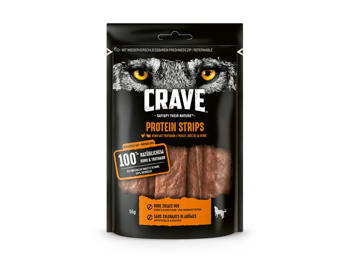 Satt deinen Hund mit unseren lustigen Crave Kausnack Protein Strips Huhn und Truthahn! Diese köstlichen Snacks sind aus hochwertigem tierischem Protein hergestellt, getreidefrei und ohne künstliche Zusätze - ein Belohnungs-Snack, den sie lieben werden, ohne schlechtes Gewissen! Also, sei lieb zu deinem Kumpel und gib ihm ein paar Crave Protein Strips, seine Zunge wird es dir danken! 🐶