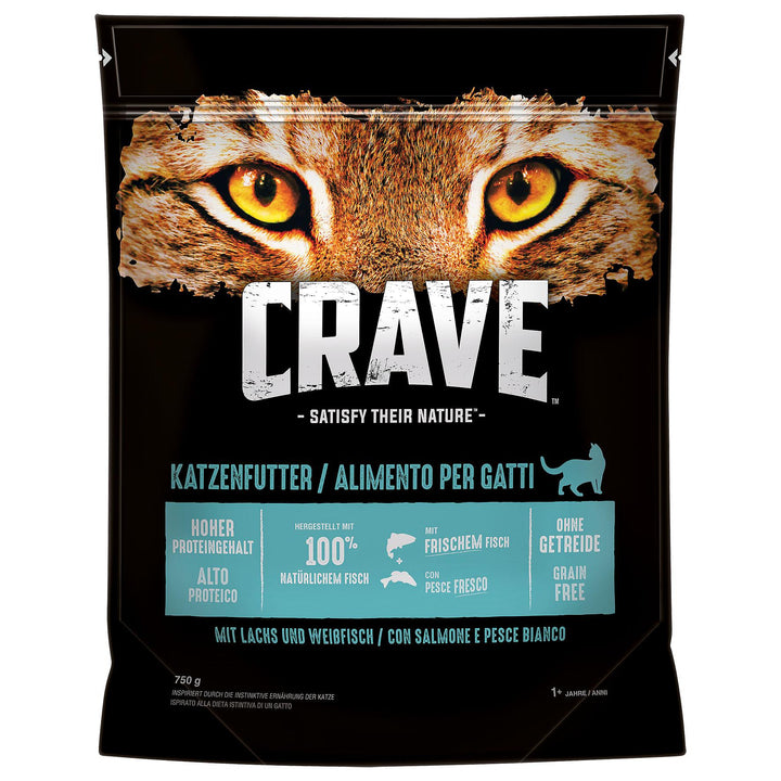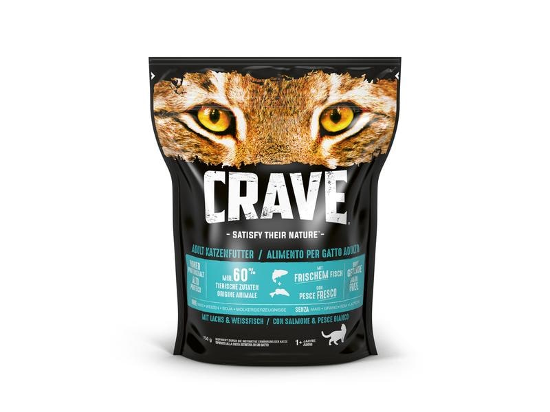 Das CRAVE™ Trockenfutter für Katzen Adult mit Lachs & Weissfisch besteht aus mindestens 60% tierischen Zutaten. Denn proteinreiche Nahrung liefert die Nährstoffe für eine starke, gesunde Katze und versorgt sie mit ausreichend Energie. Darum werden alle CRAVE™ Rezepturen stets mit hochwertigen tierischen Proteinen gefertigt. Das Trockenfutter enthält kein Getreide, keinen Mais, keinen Weizen, kein Soja und keine Molkereierzeugnisse.