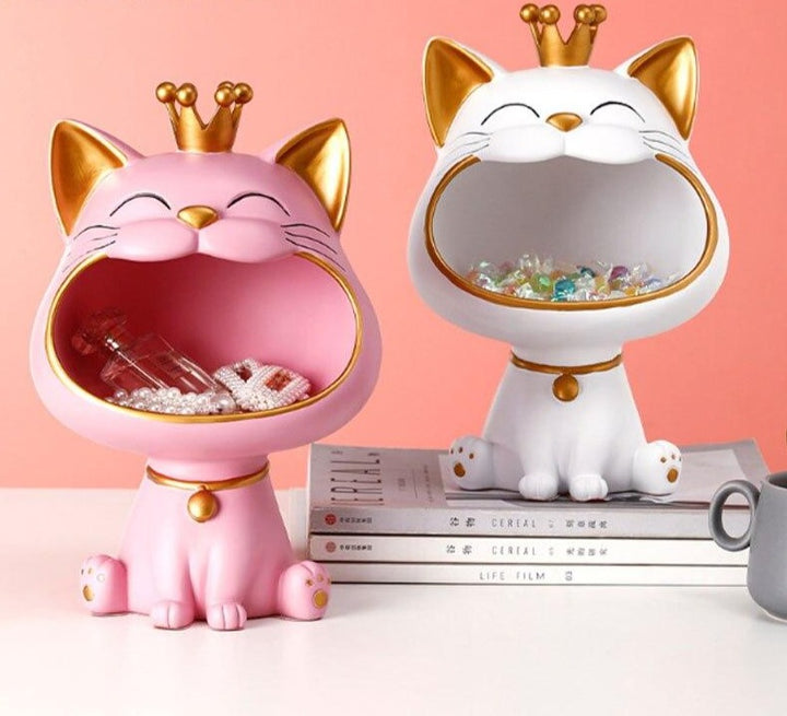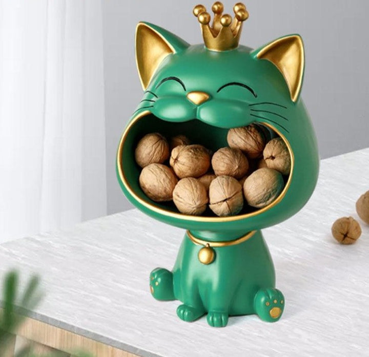 Natürlich reden wir nicht von einer echten Katze, sondern von dieser dekorativen Schale in Katzenform. Eine niedliche, breit grinsende Katze mit goldenem Krönchen und Collier und weeeeeeeiiiiiiit geöffneten Mund verschönert ab sofort deine Küche, dein Regal oder deinen Esstisch.