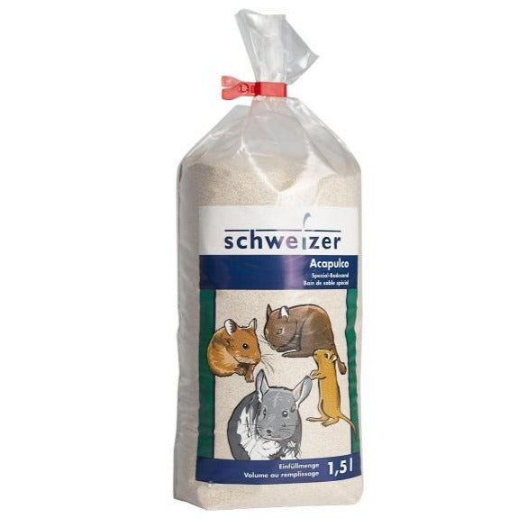 Viele Nager – zum Beispiel Chinchillas, Gerbile und Hamster – pflegen ihr feines Fell, indem sie sich auf sandigem Grund wohlig wälzen. Dieses Bettenürfnis möchte auch Ihr Heimtier ausleben. Acapulco Spezial-Badesand von Eric Schweizer pflegt wirkungsvoll und schonend dank der porösen, saugfähigen Oberfläche der Körner. Es handelt sich dabei um natürlichen Mineralstein ohne Fremdstoffe, der nicht staubt und durch seine Leichtigkeit sehr ergiebig ist.