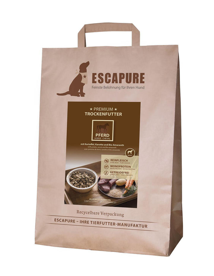Marke: ESCAPURELebensphase: Adult Zusammensetzung: Pferdefleisch 53.0%, Kartoffelflocken 34.0%, Pferdeherzen und Pferdelunge 7.0%, Karotten und BIO-Amaranth 2.0%, Vollei, Rapsöl, Pastinaken, Petersilie, Mineralstoffe Analytische Bestandteile: Rohprotein 21.00 %, Rohfett 9.00%, Rohasche 4.90 %, Rohfaser 4.30%