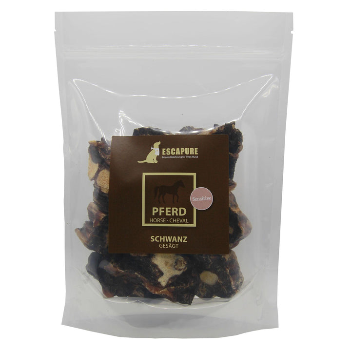 Die natürlichen Kauartikel von Escapure werden schonend getrocknet. Durch die sehr langsame Trocknung im Buchenholzrauch - bis zu 16 Tage - ist ein Splittern dieser Produkte nicht mehr möglich und das Aroma bleibt erhalten. Der Pferde Schwanz besteht ausschliesslich aus Pferdefleisch und beinhalten keinerlei Getreide. Auch auf den Zusatz von künstlichen Farb-, Aroma-, oder Konservierungsstoffe verzichtet Escapure konsequent. Dadurch ist dieser gesunde Snack auch für Allergiker geeignet.