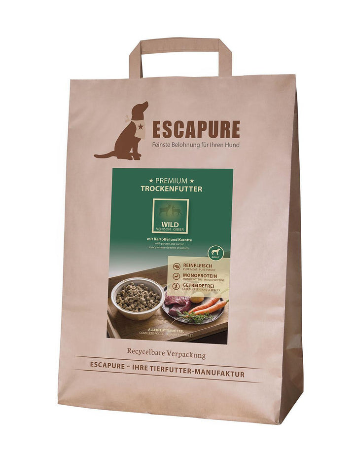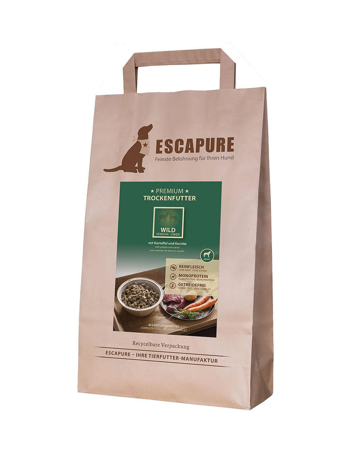 Escapure Wild PremiumDas hochwertige Alleinfuttermittel von Escapure mit viel frischem Fleisch, ausgewähltem Gemüse, Kräutern, BIO-Amaranth und auch Schwarzkümmelkuchen ist ideal für erwachsene, normal aktive Hunde und auch Allergiker.Ausgewählte Rezeptur, schonendes Backen...