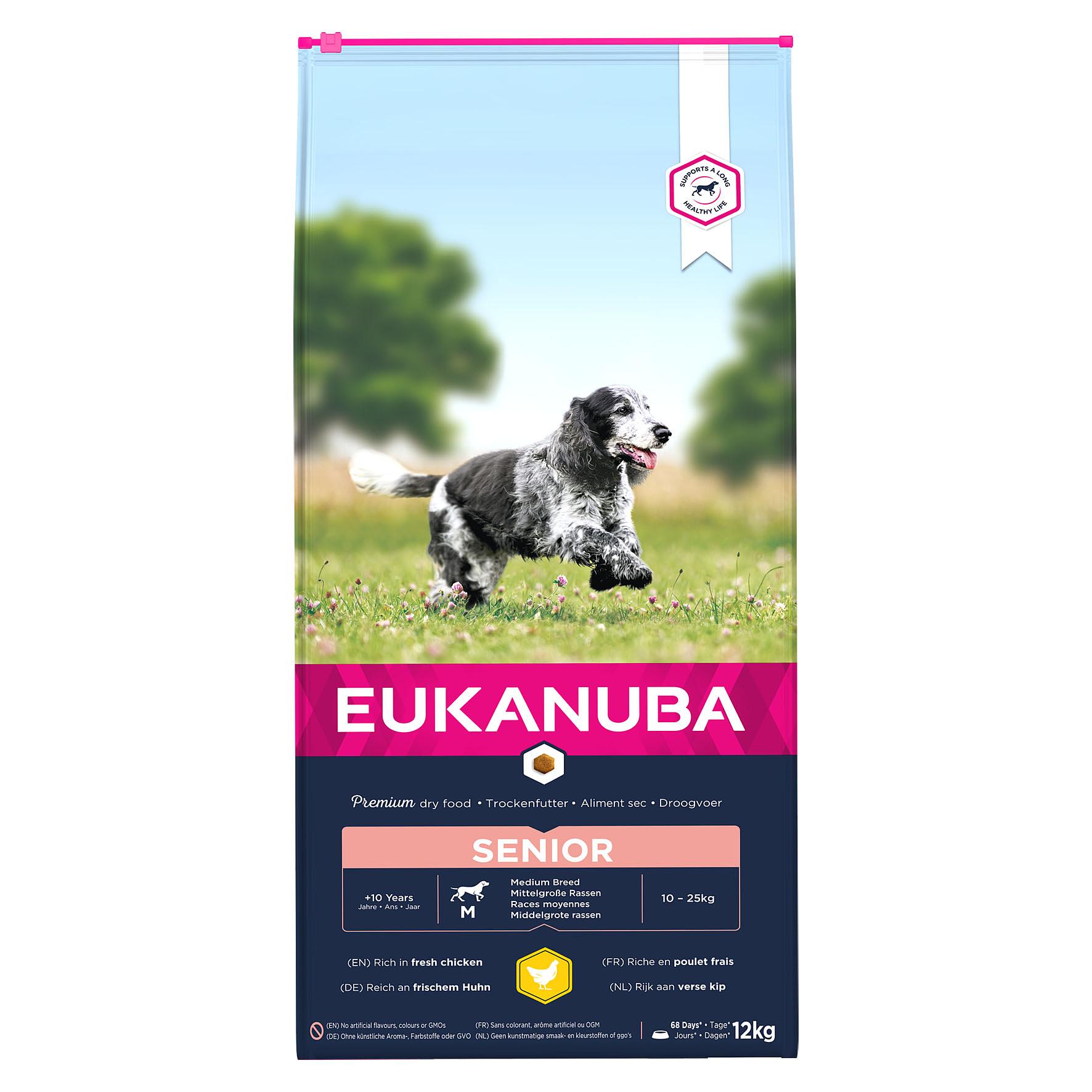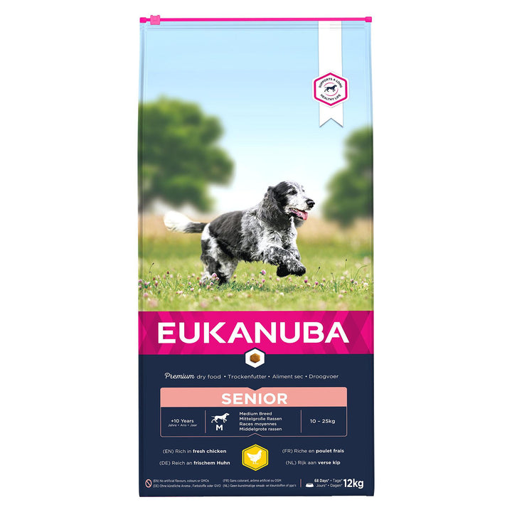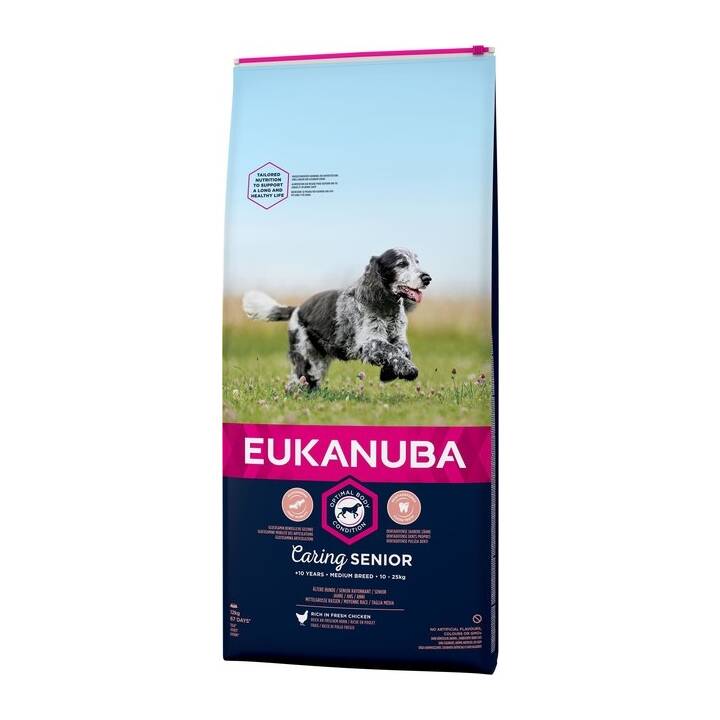Das neue und verbesserte EUKANUBA Futter ist perfekt auf ältere Hunde kleiner Rassen ab 10 Jahren abgestimmt – damit Ihr Vierbeiner in Bestform bleibt und gesund altert. Mit viel frischem Huhn. Dieses deckt optimal den täglichen Bedarf an Proteinen, Fett, Kohlenhydraten, wichtigen Vitaminen und Mineralstoffen ab und unterstützt somit die Gesundheit und des Wohlbefindens Ihres älteren Hundes. Die einzigartige, massgeschneiderte Rezeptur für ältere Hunde unterstützt eine optimale Körperkondition und eine aktive Beweglichkeit. Geeignet für Hunde mittelgrosser Rassen ab 10 Jahren.