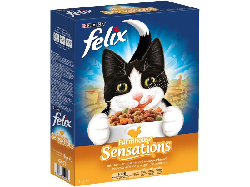 Jede kunterbunte Mahlzeit von FELIX Meaty Sensations ist randvoll mit köstlich duftenden und knusprig leckeren Kroketten in vielen verschiedenen Formen und mit einem sensationellen Geschmack mit Huhn und Truthahn. Die 100% komplette und ausgewogene Mahlzeit für Ihren Stubentiger.