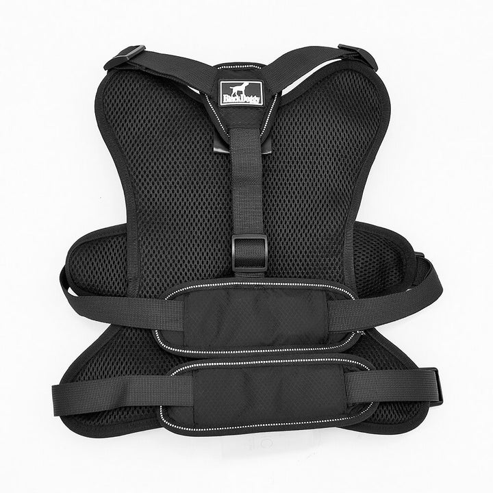 Damit werden auch mittelgrosse bis grosse Hunderassen abgedeckt. Für einen guten Sitz sorgen die individuell verstellbaren Gurte am Bauch, der Brust und der Schulter.