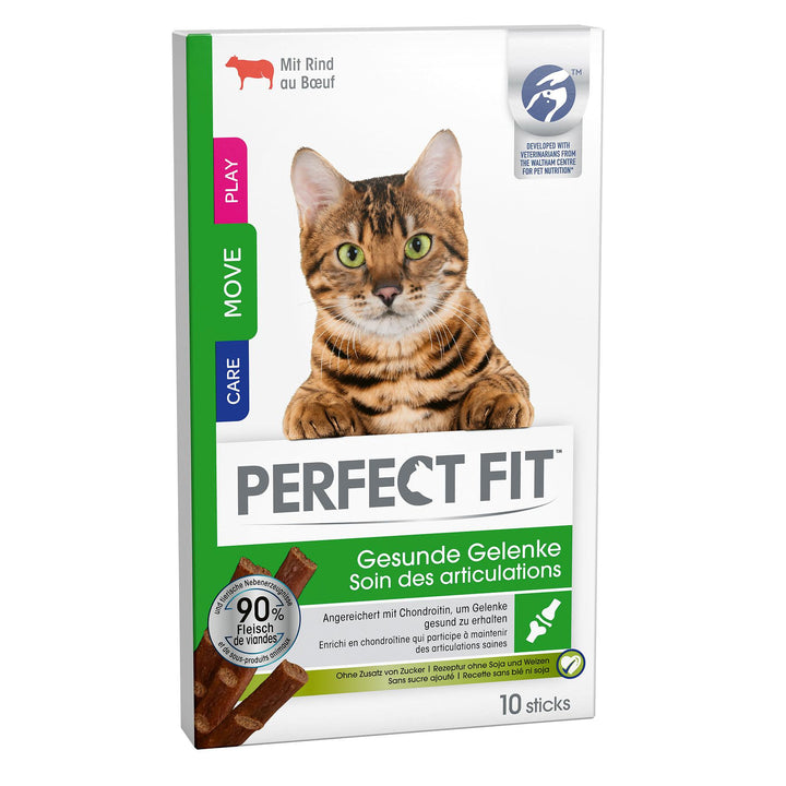 Perfect Fit Gesunde Gelenke sind unwiderstehlich leckere Sticks mit 90% Fleisch und tierischen Nebenerzeugnissen. Sie sind angereichert mit Chondroitin und Glucosamin (Aktivwirkstoffe, die essentielle Bausteine der Gelenke von Katzen sind), um die Gelenke Ihrer Katze gesund zu erhalten.