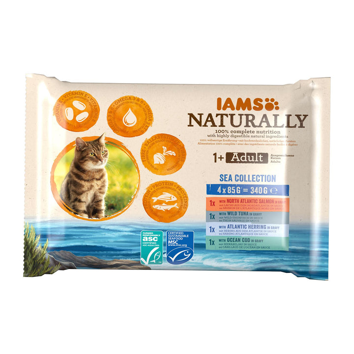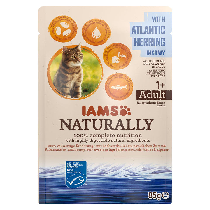 IAMS Naturally für ausgewachsene Katzen versorgt Ihr Haustier mit ausgewogenen Nährstoffen aus leicht verdaulichem und MSC zertifiziertem Hering aus dem Atlantik in Sauce für eine sichtbare Gesundheit Ihres Vierbeiners.