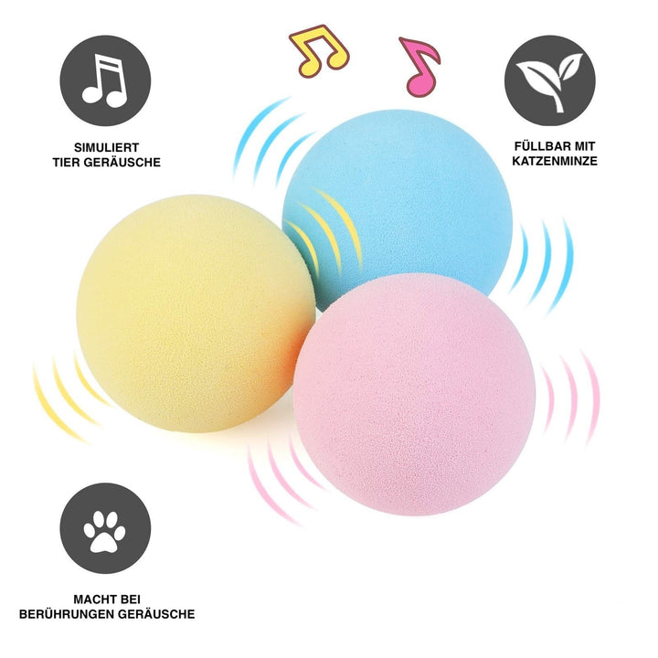 Sobald sich der Ball in Bewegung setzt bzw. berührt wird, gibt er das jeweilige Geräusch ab. Da wird Deine Katzen gewiss grosse Augen machen, wenn der Ball sogar "Lebenszeichen" von sich geben wird.
