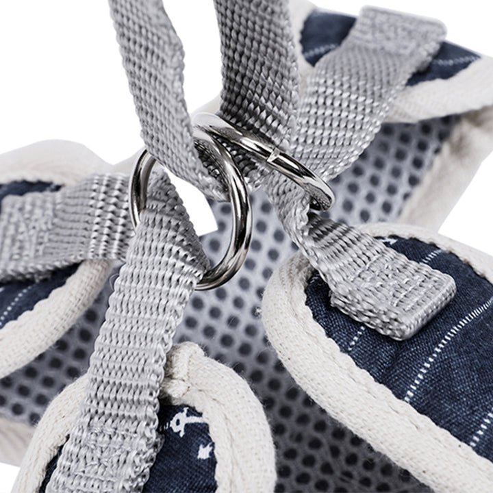 Das Katzengeschirr besteht aus einem gepolsterten, atmungsaktiven Polyester-Mesh-Material. Es lässt sich leicht anziehen und am Rücken verschliessen.