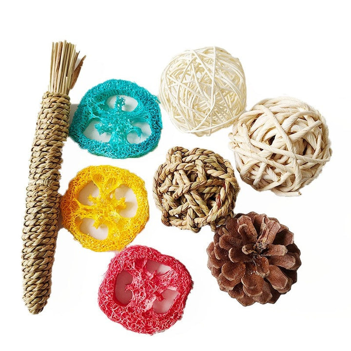 Ob es sich um Spielbälle aus Stroh oder Weide handelt, Tannenzapfen sowie geflochtener Seetang oder Meerschwamm - all dieses bekommst du bei uns und kannst sie mit gutem Gewissen deinem Tier zum Spielen und Knabbern geben.