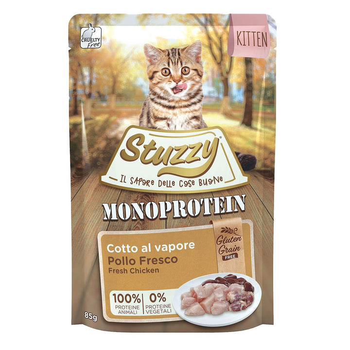 Das Stuzzy Monoprotein ist frei von Getreide und Gluten, weiter ist die Hauptzutat des Futters immer tierischen Ursprungs. Diese Zusammensetzung bewirkt, dass auch Katzen mit sensiblem Magen oder Allergien dieses Futter vertragen. Das Stuzzy Monoprotein enthält Proteine mit einem hohen biologischen Wert, sie stammen einzig aus tierischen Proteinquellen. Weiter beinhaltet das Futter weder Farbstoffe noch Konservierungsmittel.