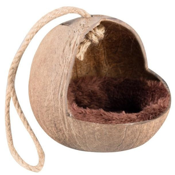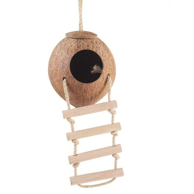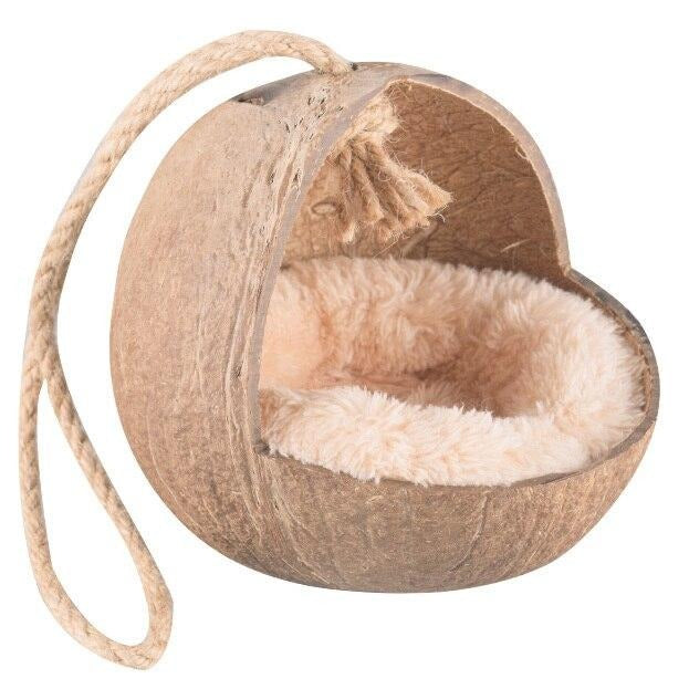 Die an der Kokosnuss befestigte Strickleiter weckt zusätzlich den Spass zum Klettern und stellt eine kleine Herausforderung für deinen Nager dar. Erst, wenn diese bezwungen wurde, können es sich deine Klettertierchen im Kokosnusshaus gemütlich machen. Mit Kokosfasern im Inneren und der Strickleiter aus Sisalseil und Naturholzsprossen ist das Kokosnussversteck ausserdem ein echtes Naturprodukt. Befestigt wird das Kokosnusshaus ganz einfach über die Sisalschlaufe am oberen Ende, die sich praktisch im Käfig einhängen lässt.