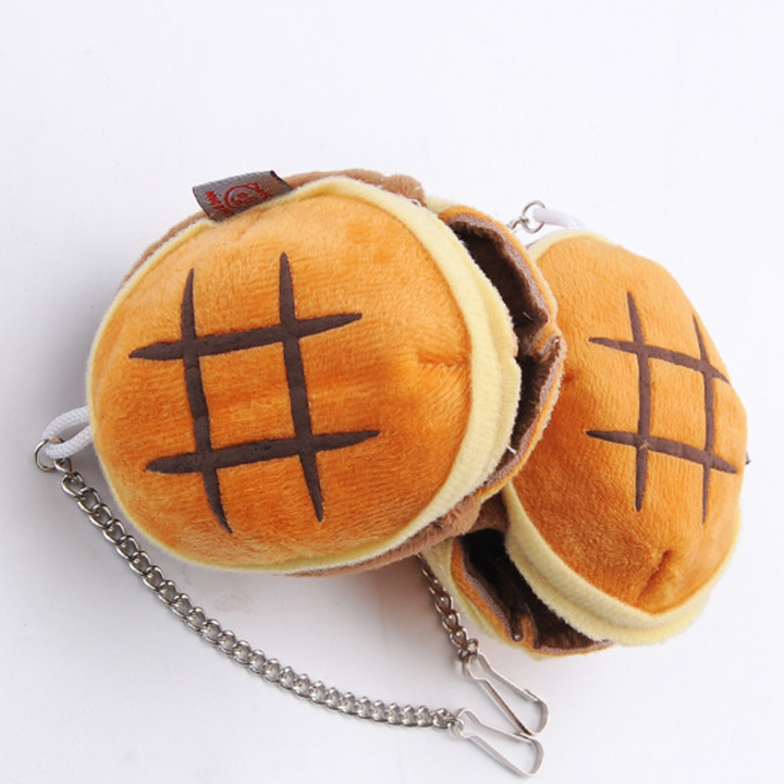 Damit der Stoff-Hamburger nicht durch den Käfig geschleppt wird, kannst du ihn mit dem angebrachten Haken an den Gitterstäben befestigen.