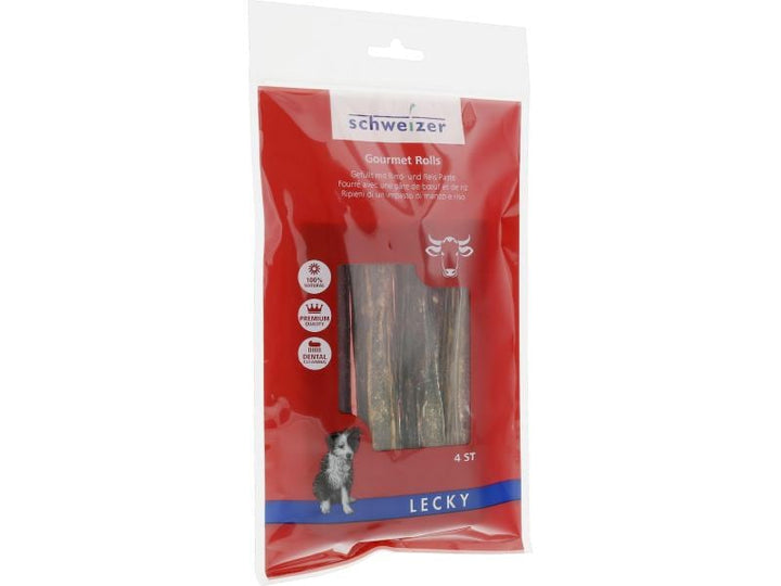 Verwöhne deinen Liebling mit LECKY Gourmet Rolls mit Rind und Reis! Der perfekte Snack für Hunde in Form von 4 saftigen, gefüllten Rindfleischrollen. Ein besonderer Genuss mit einer leckeren Paste aus Rindermuskelfleisch, Rinderlunge, Rindermilz und Reis - dein Hund wird es nicht bereuen! Da kann man sich nur "Lecker!" denken.