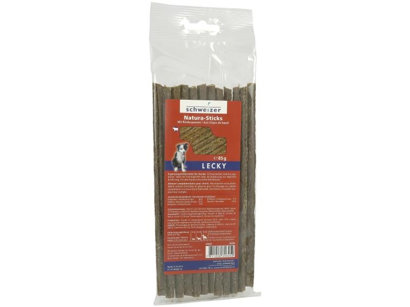 Unsere Eric Schweizer LECKY Natura-Sticks sind die ultimative Belohnung für deinen Liebling! Jede Packung enthält 85 g feinstes Rinderpansen-Vergnügen! Brech dir einfach ein Stückchen ab und schon wird dein Hund zum "Good Boy" - so kannst du ihn in Windeseile motivieren und fördern! Und für Geniesser hat es ausserdem noch jede Menge schmackhafte Delikatessen zu bieten! 🐾