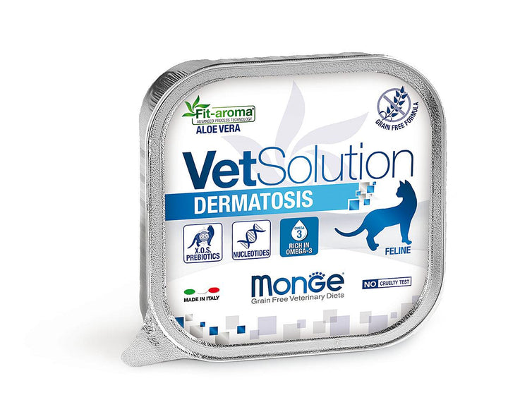 Monge VetSolution Dermatose Feline ist ein diätetisches Alleinfuttermittel zur Unterstützung der Hautfunktion bei Dermatose und übermäßigem Haarausfall bei Katzen.