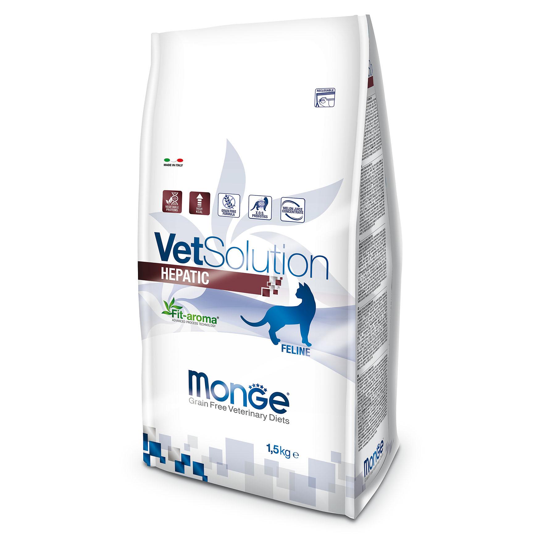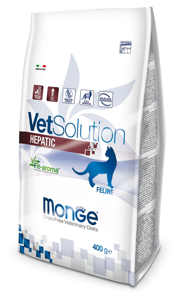 MONGE VETSOLUTION HEPATIC FELINE ist ein komplettes Diätfuttermittel für Katzen, das zur Unterstützung der Leberfunktion bei chronischer Leberinsuffizienz entwickelt wurde. Es enthält Melonensaftkonzentrat zur Neutralisierung freier Radikale, Distelsamen zur Unterstützung der Leber, Xylo-Oligosaccharide (XOS) zur Sicherung der Darmmikrobiota und die Formel ist gekennzeichnet durch hochwertiges Eiweiß,  einem mäßigem Gehalt an Eiweiß und einem hohen Gehalt an essentiellen Fettsäuren.