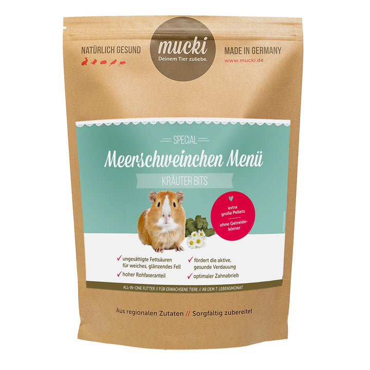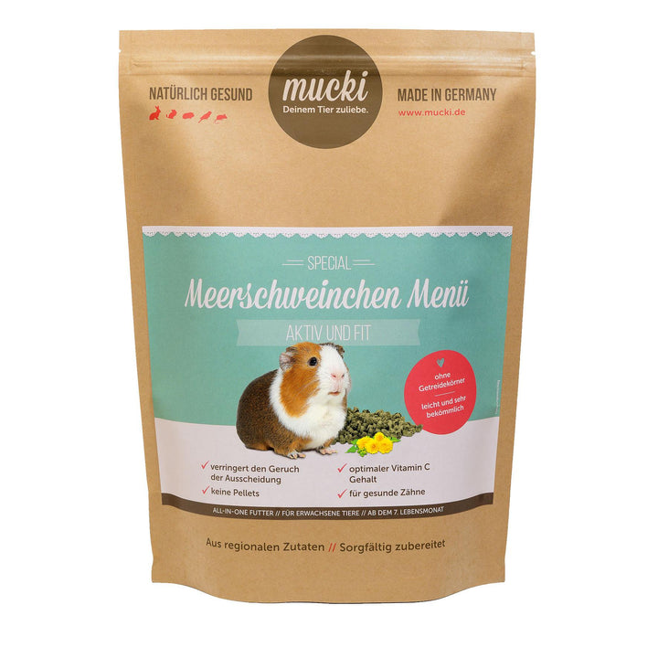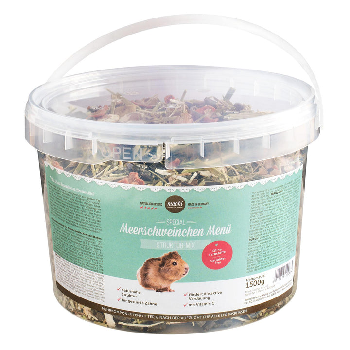 Mucki Meerschweinchen Menü Struktur ist ein rohfaserreiches Mehrkomponentenfutter für erwachsene Meerschweinchen ab dem 7. Lebensmonat. Es besteht ausschliesslich aus regionalen Zutaten, die sorgfältig verarbeitet wurden, damit möglichst alle wichtigen Vitamine und...