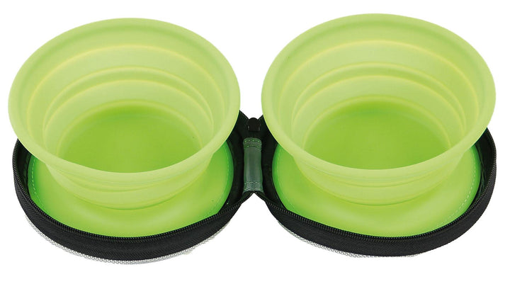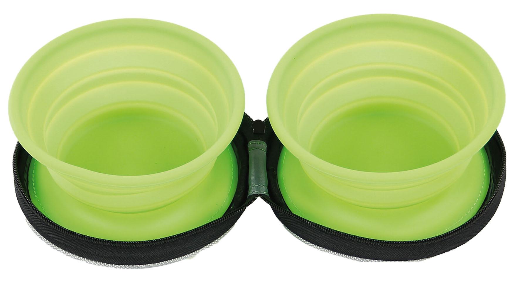 Faltbarer Reisenapf aus Silikon mit zwei Schüsselchen. Der ideale Begleiter auf Reisen, bei Wanderungen oder im Urlaub. Der Reisenapf aus Silikon kann zusammengefaltet werden und ist direkt in einem Etui integriert. Dadurch kann der Napf sauber und platzsparend verstaut werden. So passt er problemlos in jede Tasche oder in den Rucksack.