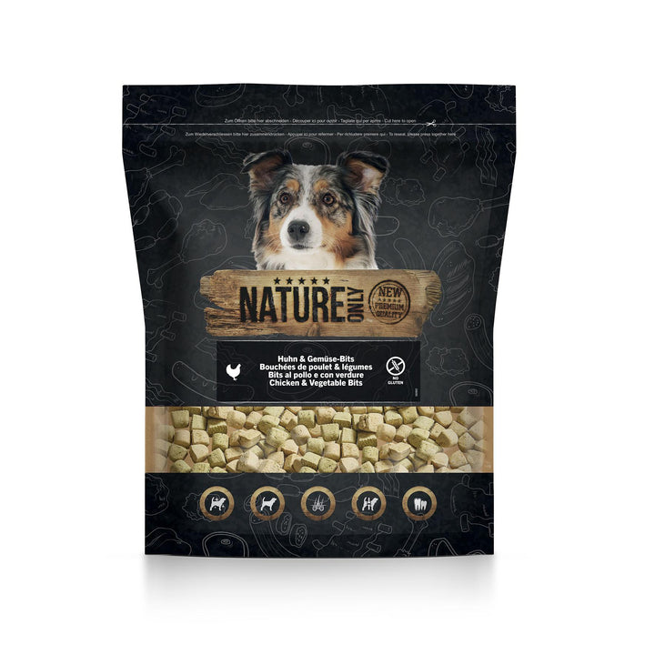 Nature Only weiss, dass Dein Vierbeiner sich über gesunde Leckerbissen freut! Unsere Huhn&Gemüse Bits sind eine gesunde Leckerei für Hunde, 100% getreidefrei. Ein schneller, leckerer Snack, der den Magen Deines Hundes...