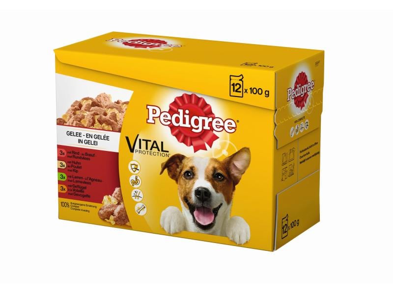 12 Beutel à 100 g Fleisch- und Gemüsekreationen in Gelee im praktischen Portionenbeutel Mit Geflügel, Rind und Lamm Packungsgrösse: 1.2 kg Frisch aus dem Portionsbeutel ist die Pedigree Feuchtnahrung ein echter...