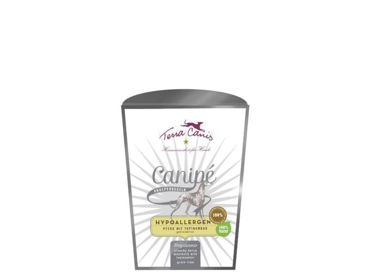 Herzhafter Knusper-Snack für Hunde mit Futterunverträglichkeiten und/oder Allergien. Canipé Knusperkugeln werden mit viel Liebe und Sorgfalt in einer kleinen deutschen Manufaktur in handwerklicher Art hergestellt. Mit ausschließlich frischem Muskelfleisch, gesundem Gemüse, Obst und Kräutern: in echter Lebensmittelqualität. Ohne Verwendung synthetischer Zusätze. Und so natürlich und lecker riechen und schmecken unsere Knusperkugeln auch - einfach wie hausgemacht! Als echtes Naturprodukt besitzt jedes Canipé einen individuellen Charakter: mal größer, mal kleiner, mal dunkler, mal heller gebacken. Eines jedoch bleibt immer gleich: die kompromisslose, lebensmittelechte Spitzenqualität.
