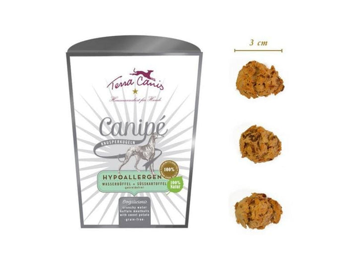 Herzhafter Knusper-Snack für Hunde mit Futterunverträglichkeiten und/oder Allergien. Canipé Knusperkugeln werden mit viel Liebe und Sorgfalt in einer kleinen deutschen Manufaktur in handwerklicher Art hergestellt. Mit ausschliesslich frischem Muskelfleisch, gesundem Gemüse, Obst und Kräutern: in echter Lebensmittelqualität. Ohne Verwendung synthetischer Zusätze. Und so natürlich und lecker riechen und schmecken unsere Knusperkugeln auch – einfach wie hausgemacht! Als echtes Naturprodukt besitzt jedes Canipé einen individuellen Charakter: mal grösser, mal kleiner, mal dunkler, mal heller gebacken. Eines jedoch bleibt immer gleich: die kompromisslose, lebensmittelechte Spitzenqualität.