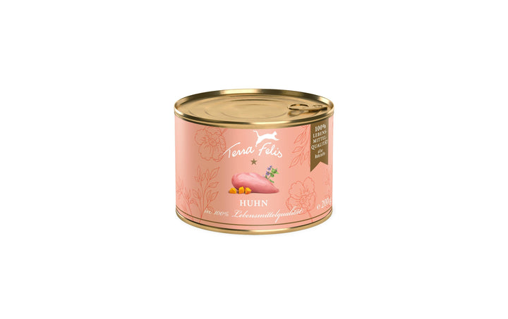 Die getreidefreien Terra-Felis-Menüs bieten mit 90% frischem Muskelfleisch und wertvollen Innereien einen sehr hohen Fleischanteil. Dies bietet der Katze als reinem Fleischfresser die für sie wichtigen Omega-6-Fettsäuren und viel tierisches Protein, das zur Energiegewinnung und für sämtliche Stoffwechselprozesse benötigt wird. Für eine gesunde Darmfunktion und Darmperistaltik benötigt die Katze eine geringe Menge an Ballaststoffen. Alle Terra-Felis-Menüs werden daher um eine ausgewählte Gemüsesorte sowie Katzenminze ergänzt. Abgerundet werden die Mahlzeiten durch die Zugabe von Taurin und Rapsöl, das reich an Omega-3-Fettsäuren ist. Es werden ausschliesslich Rohstoffe in 100% Lebensmittelqualität verwendet. Diese Qualität und Frische spiegelt sich in dem köstlichen und feinen Geruch der Menüs wider und führt zu einer guten Akzeptanz bei Katzen.