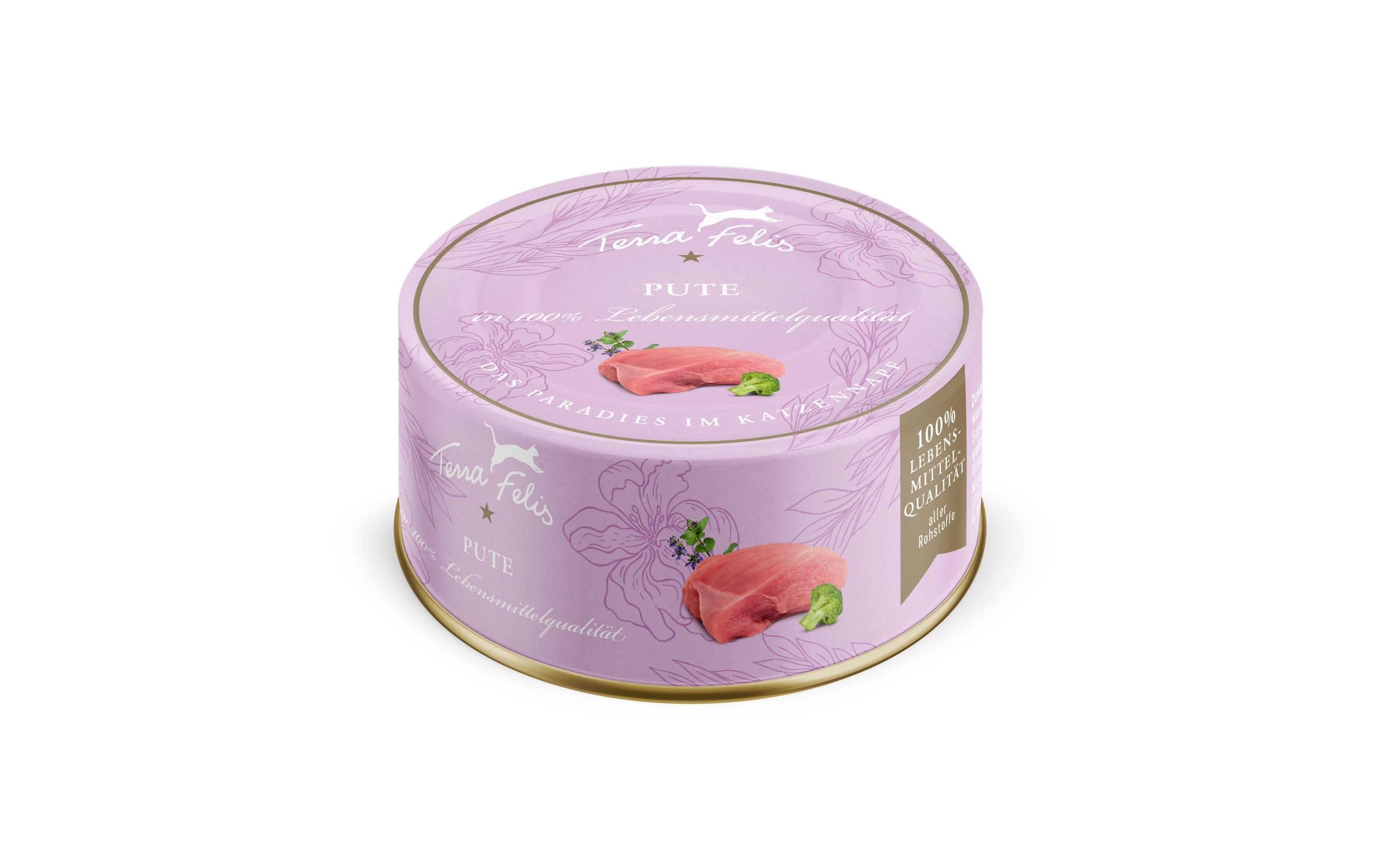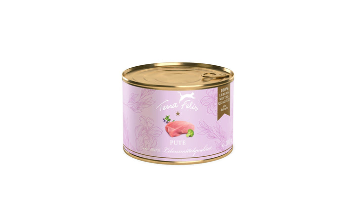 Die getreidefreien Terra-Felis-Menüs bieten mit 90% frischem Muskelfleisch und wertvollen Innereien einen sehr hohen Fleischanteil. Dies bietet der Katze als reinem Fleischfresser die für sie wichtigen Omega-6-Fettsäuren und viel tierisches Protein, das zur Energiegewinnung und für sämtliche Stoffwechselprozesse benötigt wird. Für eine gesunde Darmfunktion und Darmperistaltik benötigt die Katze eine geringe Menge an Ballaststoffen. Alle Terra-Felis-Menüs werden daher um eine ausgewählte Gemüsesorte sowie Katzenminze ergänzt. Abgerundet werden die Mahlzeiten durch die Zugabe von Taurin und Rapsöl, das reich an Omega-3-Fettsäuren ist. Es werden ausschliesslich Rohstoffe in 100% Lebensmittelqualität verwendet. Diese Qualität und Frische spiegelt sich in dem köstlichen und feinen Geruch der Menüs wider und führt zu einer guten Akzeptanz bei Katzen.