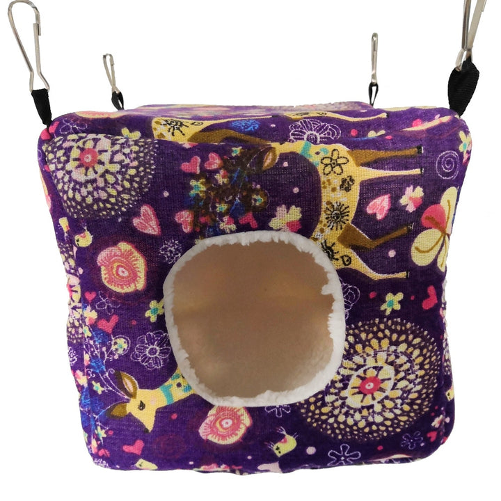Der Hängewürfel ist von aussen mit einem bunten, robusten Canvasstoff versehen. Von innen ist der Würfel mit kuscheligem Fleecefutter versehen. In dem Würfel hat es Dein Hamster, Deine Ratte, Deine Maus, Dein Meerschweinchen und Co. gewiss warm und kuschelig. Und durch die Aufhängung, die sich ganz einfach an den Gitterstäben befestigen lässt, schwingt Dein Tier gemütlich Hin und Her und kann sich sanft in den Schlaf wiegen oder im Wachzustand einfach den erhöhten Ausblick geniessen.