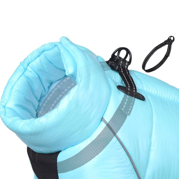 Am Rücken ist extra ein D-Ring für die Hundeleine angebracht. So kannst du sogar auf das Hundehalsband verzichten, bzw. musst es nicht unter dem Jackenkragen heraus fummeln.