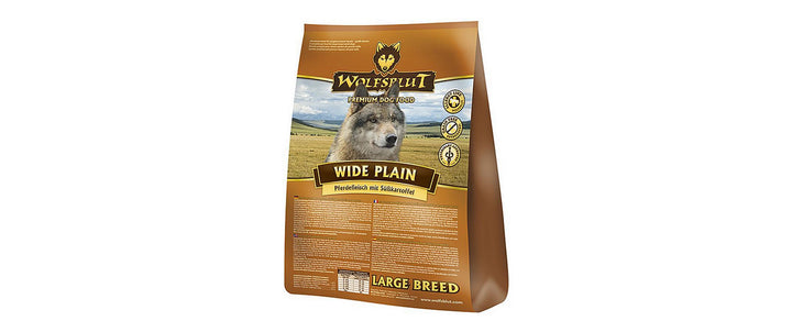 Von grossen Hunden spricht man ab einer Widerristhöhe (Schulterhöhe) von etwa 68 cm. Dazu gehören z. B. Rottweiler, Deutsche Dogge, Deutsche Schäferhund, Bernhardiner und Berner Sennenhund. Grosse Hunde können eine Schulterhöhe von über einem Meter erreichen und dabei über 90 kg schwer werden. Generell lässt sich sagen, dass mit dem Gewicht auch die Belastung auf die Gelenke zunimmt. Grosse Hunde beanspruchen daher ihre Gelenke z. B. beim Rennen, Springen oder Treppenlaufen deutlich stärker als ihre kleinen Verwandten. Die Zusammensetzung von WIDE PLAIN – LARGE BREED Trockenfutter geht aber noch einen Schritt weiter. Die einzelnen Futterbestandteile wurden gemeinsam mit Wissenschaftlern nach Art und Menge zusammengestellt, wodurch WIDE PLAIN – LARGE BREED dem neuesten Wissensstand (über die ErnährungsBettenürfnisse von Hunden) entspricht.Dazu trägt auch der Wolfsblut Gelenkschutz PLUS, ein besonderer Wirkstoffkomplex aus 5 aussergewöhnlichen Naturwirkstoffen, bei. CMO (Cetyl-Myristoleate) ist ein Fettsäureester, das als ein Impfstoff für die Gelenke beschrieben wird, der gesunde Säugetiere gegen mögliche Gelenkentzündungen immunisieren kann. Chondroitin und Glucosamin sind Bestandteile des Knorpelgewebes und kann eine positive Wirkung auf die Kniegelenke haben. Nopalia ist ein Konzentrat des Naturstoffs Beta-Sitosterol und kannschädigenden Reizen entgegenwirken. MSM (Methylsulfonylmethan) ist eine Schwefelverbindung, die eine positive Wirkung auf die Gelenke haben kann. WIDE PLAIN – LARGE BREED verbindet das Ursprüngliche mit den Bettenürfnissen Ihres Hundes und ermöglicht so eine natürliche und artgerechte tägliche Ernährung. Dabei dienen alle Zutaten dieser einzigartigen Kombination dem Erhalt der Gesundheit Ihres Hundes.